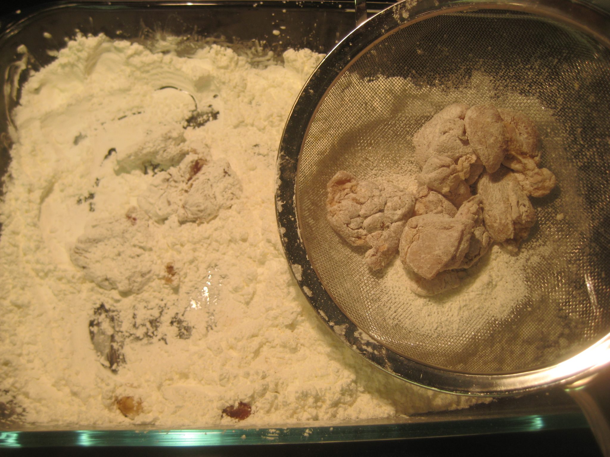 6. In batches, coat the chicken with potato or corn starch, shake off the excess starch
