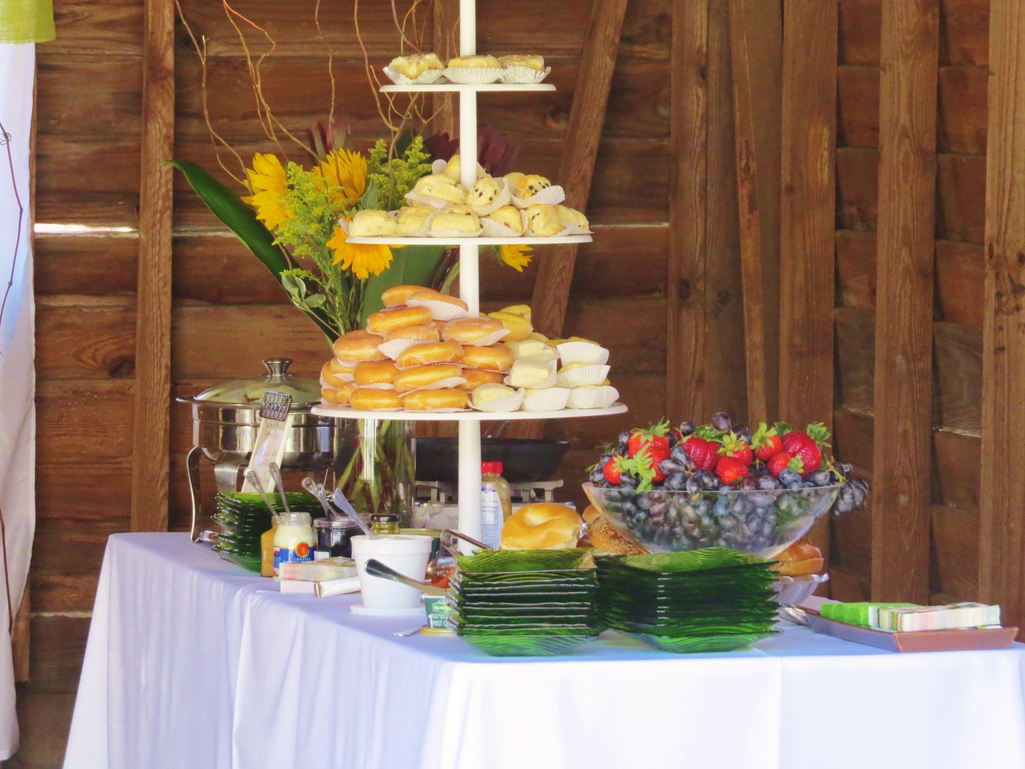 The menu for the day was hot ham biscuits with peach mustard, blueberry scones, donuts, gluten-free chocolate chip cranberry muffins and bacon, apple cinnamon rolls. We also did a complete bagel set up with assorted cream cheeses, smoked salmon, tomatoes, red onion slices and capers.