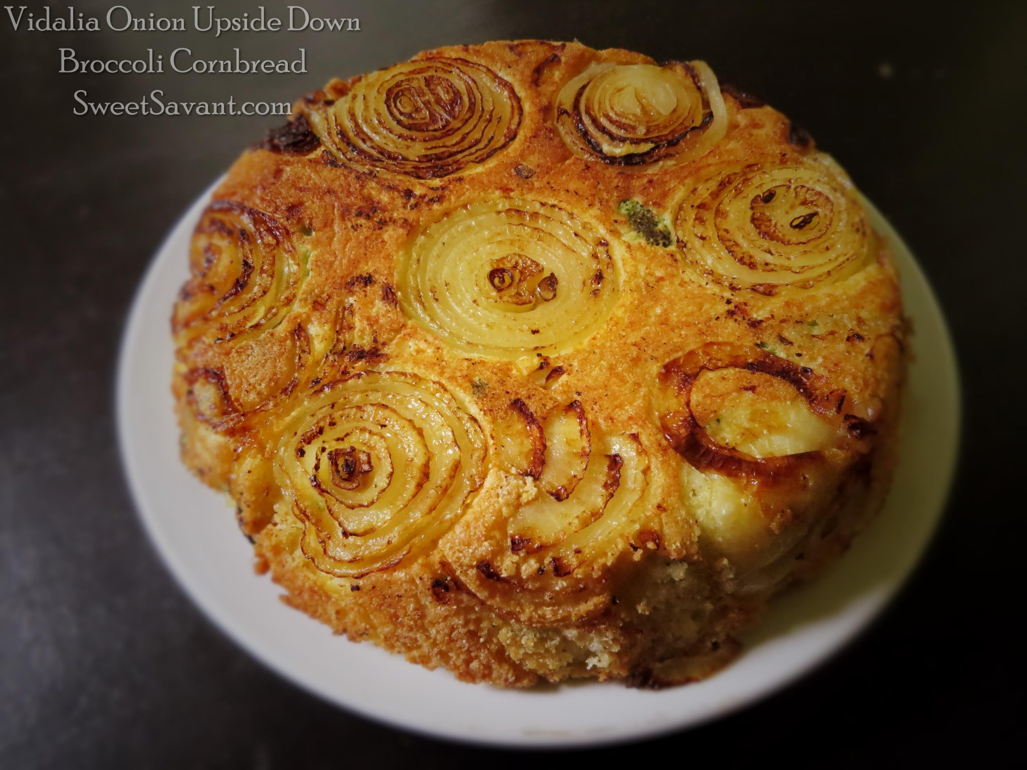 I was thinking about my late Great Aunt Ethel’s broccoli cornbread ( it was delicious but a bit too sweet for me, sorry auntie. She used a boxed cornbread mix) and I was also thinking about the five pounds of VIDALIA ONIONS I have in my fridge. I put the two together and I came up with this Vidalia Onion Upside Down Broccoli Cornbread.
